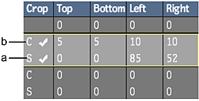 - Set values for cropping and softness in the Top, Bottom, Left, and Right fields. Once you set a value in one of the Crop or Softness fields, white checkmarks indicate that Crop and Softness are enabled.