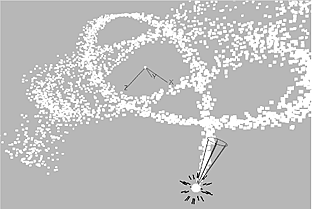 Typically, you use Timestep with a particle manipulator or bouncer on a particle stream. In the following example, the same particle settings and manipulator (AccPoint) are used. Only the timestep values are different. The particle stream on the left uses a timestep of 1 while the stream on the right uses a timestep of 6.