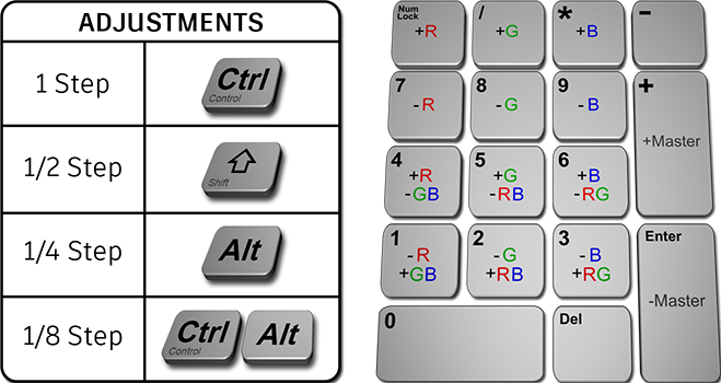 So Ctrl+8 in Log mode decreases the brightness in the Green by 1 step. Ctrl+Alt+8 in the same mode decreases the brightness in the Green by 1/8th of a step.