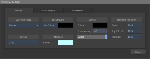 - Use to select a Scopes Preset. You can select from one of the supplied presets or a user created preset.