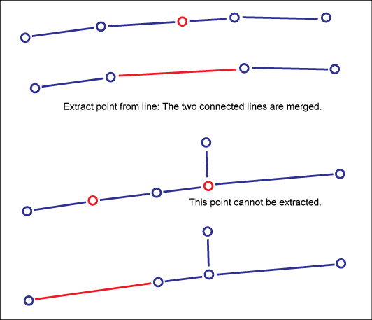 If you delete a point, be sure to maintain a valid network topology. For example, when you delete the point you must merge the two connected lines. If more than two lines connect at the point, you cannot delete the point.
