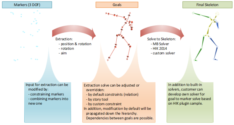 You can also customize the solving from the goals to the bones. Usually, the solving is performed using the HIK solver or MotionBuilder's internal solver, but you can also use your own custom solver. As a post-processing step, you can modify or override parts of a solve output such as, an arm in a complex rig situation.