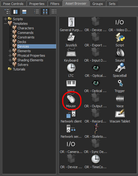 "Browsing/Templates/Devices" - The Asset Browser path. This path is illustrated by the node hierarchy in the navigation tree. This path must always begin with Browsing/."Mouse" - The entry name. It corresponds to the red circle in the following figure.Argument 3: "MyMouse" - The custom name of the object.
