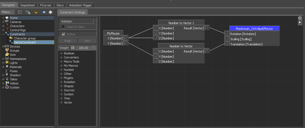 MyMouse box acts as a data source.Plasticman_Ctrl:HipsEffector box is being constrained.Number to Vector and Number to Vector 1 boxes convert the X and Y data from the mouse into 3D vectors.The following code sample shows how to create these boxes and set their position in the Constraint Settings window.