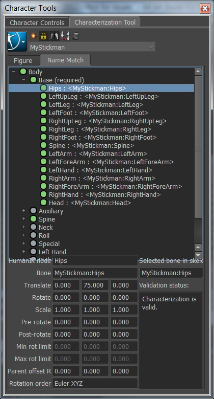 An FBCharacter is said to be "characterized" if a minimal hierarchy of FBModel has been assigned to the "Base" (required) character slots. The following list presents the names of these required character slots: HipsLink, LeftUpLegLink, LeftLegLink, LeftFootLink, RightUpLegLink, RightLegLink, RightFootLink, SpineLink, LeftArmLink, LeftForeArmLink, LeftHandLink, RightArmLink, RightForeArmLink, RightHandLink, HeadLink. The image below shows a valid characterization of the required character slots.