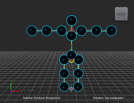 Once the skeleton is created, we apply cartoon-shaded spheres to each joint to make our character more visually appealing. In practice however, we would assign a mesh to the skeleton's 'Reference' model. The vertices of this mesh would be weighted according to the character's bones. This lengthy process is omitted for clarity.
