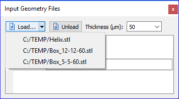 Geometry files can be imported and removed from the buildstyle project. While loading geometry files, you must choose one of the buildstyle’s supported layer thicknesses which is then used for all buildstyle operations within the project.