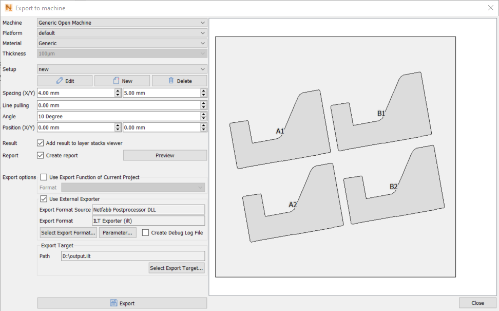 | Create Report | A report document can be created in addition to the exported file. This is a PDF document containing an image of the test platform and a list of all parameter variations. Clicking Preview generates and opens this report immediately. |