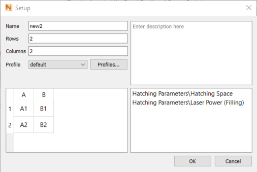 In the parameter dialog you configure the rows and columns at which the parameter variation should be applied. The parameter can be chosen from the part related buildstyle parameters. First the parameter group must be selected and then the parameter within the group. Platform-related buildstyle parameters cannot be configured part-by-part. Those values are set by editing the underlying parameter profile. The presented list of parameter values shows the variation along the rows or columns of the test build setup.