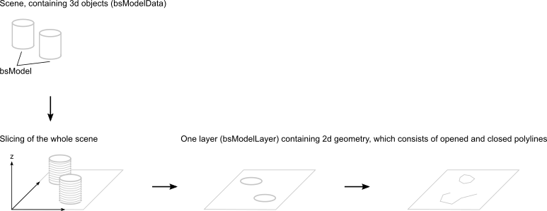 The Advanced Toolpath Utility buildstyle processor slices the whole scene and stores a bsModelLayer object for each slice (layer). Every layer contains 2D geometry data for all meshes, that intersected with that layer. These layers are filled with polylines (sets of connected points) and these polylines can either be closed (start and end point are connected) or opened (start and end points are not connected).