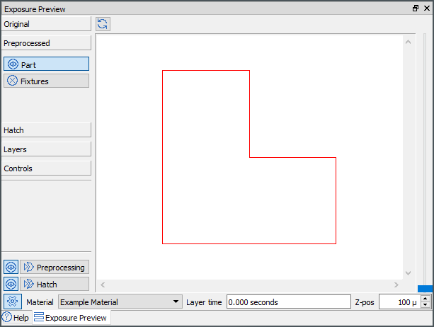 The exposure preview panel allows to show or hide part and support geometry. The Preprocessed section of the tab control on the left side can be used for this. Hiding the support structures (Fixtures) shows the processed rectangle only: