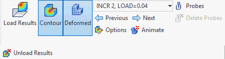 Display Contour Plot Display Deformed Plot Edit Plot Combo Box (Select Subcases / Increments / Modes / Time Steps / Frequencies) Previous Step Next Step Options - Edit Results (see Plot Templates section) Probe - Query Results Delete Probes (removes probes you have anchored to the model) Unload Results (Click Expand arrow to access) |