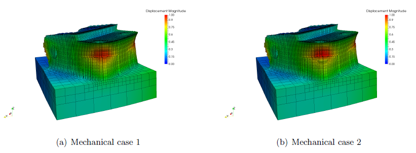 Figure 2 shows the results for cases 07_mechanical1 and 07_mechanical2 at the 3rd to last increment, while the part and supports are still attached to the build plate. The results have been warped by displacements that are magnified 5x to better show the effect of failed elements.