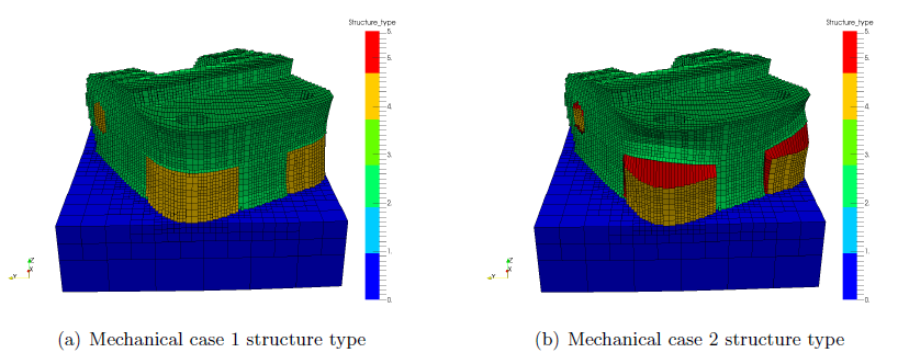 For case 07_mechanical1, seen in Figure 2 (a), elements only have values 0–4, and all support structures are coded as type 4, unfailed supports. This is as expected, as this analysis does not have the support structure card *UTSR enabled. For case 07_mechanical2, shown in Figure 2 (b), there are numerous failed supports, as indicated in the simulation log. Note how the failed elements are stretched. This occurs because the failed elements no longer have any strength to resist deformation.