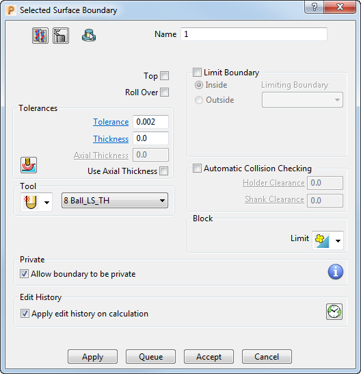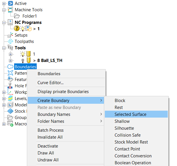 Selected Surface Boundaries are recalculated if the selected surfaces change. This means that they behave like toolpaths in the way they take account of the selection state at the time of calculation.
