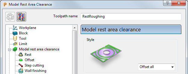 The rest roughing toolpath uses a smaller tool to eliminate the large terraces and to rough areas of the model that the large roughing tool could not reach, such as pockets and corners.