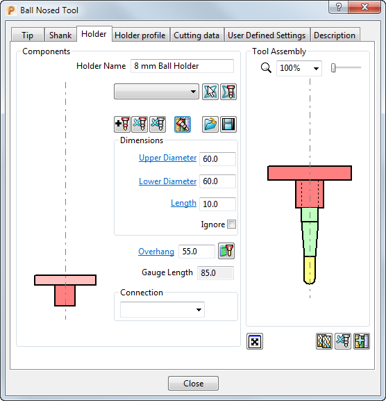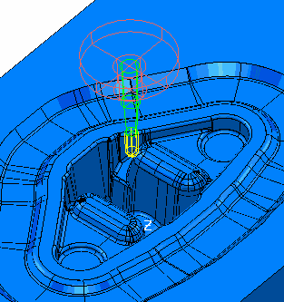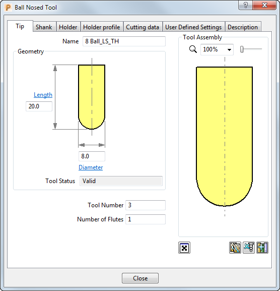 The tool currently selected for the Steep and Shallow Finishing strategy dialog is the same tool that was used for the rest roughing toolpath. This tool is not appropriate for the current toolpath strategy, and must be changed. This example uses an 8 mm (5/16 inch) ball nosed tool.