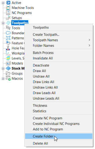 Create Folder — Select to create a folder called Folder1. You can rename this folder in the normal way, and drag and drop entities of the particular type into the folder (for example, toolpaths into a toolpath folder).