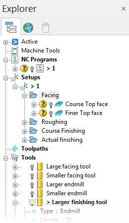 entity broadly refers to all entries in the Explorer.) The entities in the Explorer are grouped together by type, for example, toolpaths are grouped in the