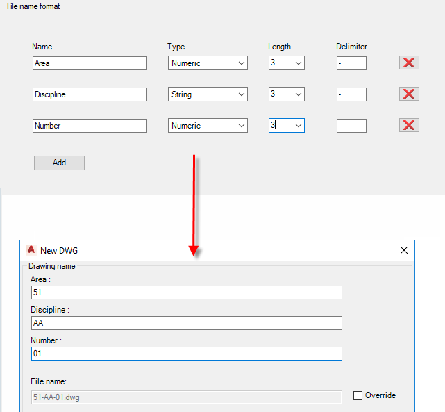 Sets up the format for file names, which is reflected in the New DWG dialog box that designers use to create new drawings.