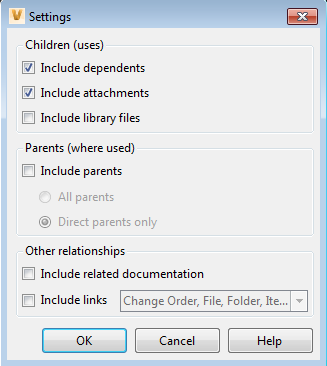 Specify whether only the children of the file, the parents of the file, or all related files are included in the vault operation. Vault Professional users can also decide whether to include linked objects.
