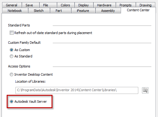 - Inside the Inventor Application Options dialog, make sure that Inventor is configured to use Vault for Content Center Libraries.
