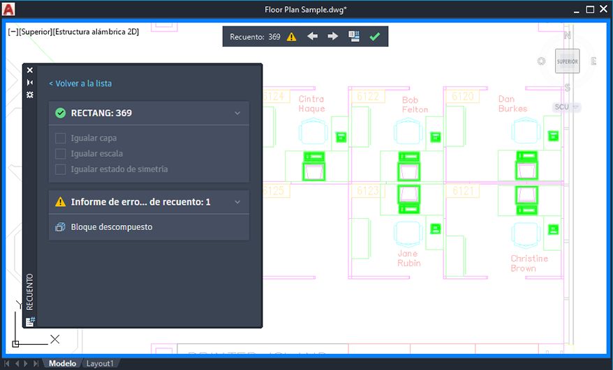 Nota: En la paleta Recuento, solo se muestran los bloques visibles en el espacio modelo.