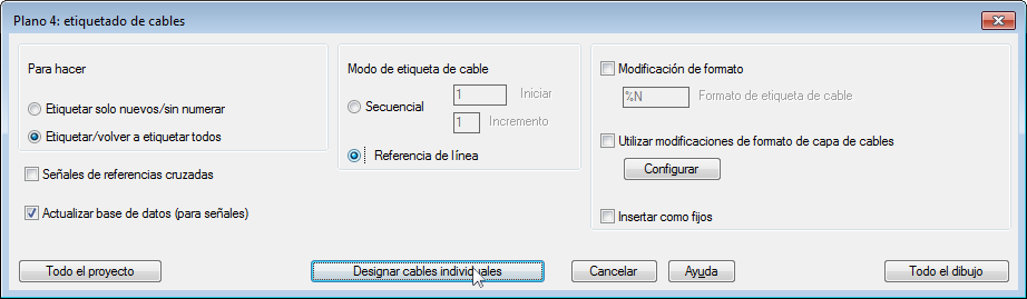 Puede procesar y etiquetar cables con números de cables secuenciales o con números de cables según el inicio de la posición de referencia de línea del equipotencial. Cuando los números de cable se insertan automáticamente en un dibujo, no se duplican.