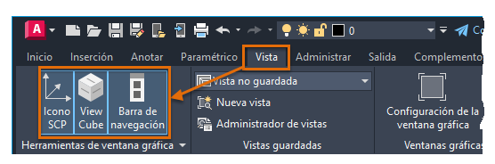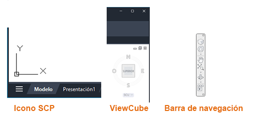El sistema de coordenadas personales resulta útil en algunos dibujos 2D y es fundamental para el modelado 3D. Si no se utiliza el SCP con frecuencia, puede ocultarlo. Lo mismo sucede con el control ViewCube y la barra de navegación.