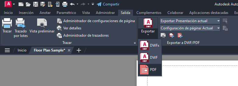 La primera vez que utilice la función de exportación rápida, es posible que deba seleccionar uno de los siguientes formatos de salida: PDF, DWF o DWFx. Una vez seleccionado el formato, se puede hacer clic directamente en el botón Exportar.