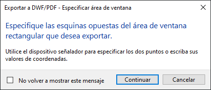 En el cuadro de mensaje Exportar a DWF/PDF - Especificar área de ventana, haga clic en Continuar para seleccionar el área.