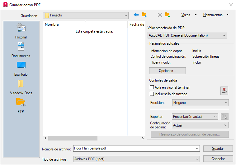 Si Tipo se ha establecido en Archivos de planos múltiples, al archivo PDF (o DWF) se le asigna un nombre mediante el nombre de archivo del dibujo como, por ejemplo, A-02.pdf.