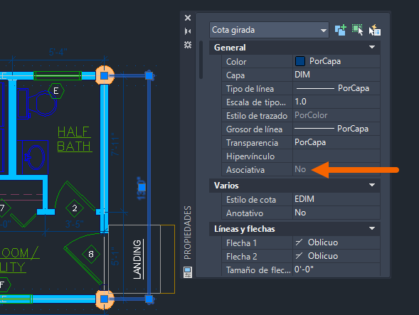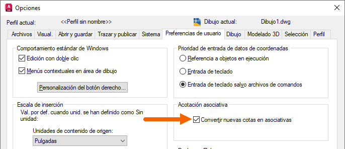 Por defecto, todas las cotas nuevas son asociativas. Esto se puede cambiar en el cuadro de diálogo Opciones.