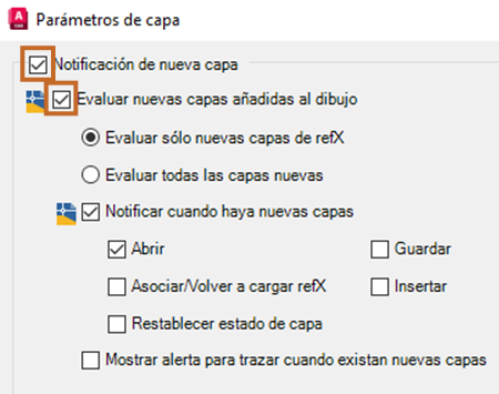 Cada opción indica cuándo se mostrará la notificación. Por lo tanto, si se selecciona Abrir y hay una capa nueva, se muestra una notificación al abrir el dibujo. Si se selecciona Guardar y hay una capa nueva, se muestra una notificación cada vez que se guarda.