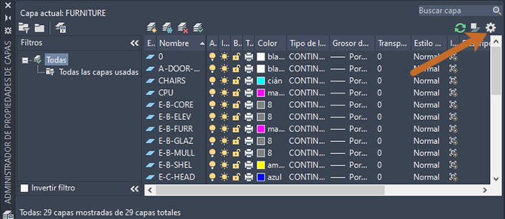 Supongamos que desea que la capa FURNITURE sea la actual. Por supuesto, podría simplemente abrir la lista de capas y desplazarse hasta encontrar la capa FURNITURE. En su lugar, vamos a utilizar Establecer como actual para cambiar rápidamente la capa actual.