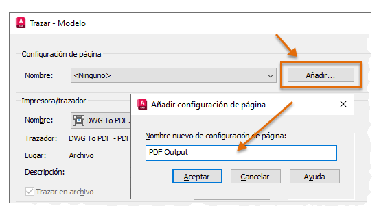 Al añadir una configuración de página en el cuadro de diálogo Trazar, se guarda una instantánea de todos los parámetros de trazado y se les asigna un nombre.