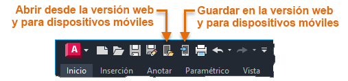 Guarde un archivo en la versión web y para dispositivos móviles de AutoCAD. Para ello, haga clic en Guardar en la versión web y para dispositivos móviles (comando GUARDARENWEBMOVIL).
