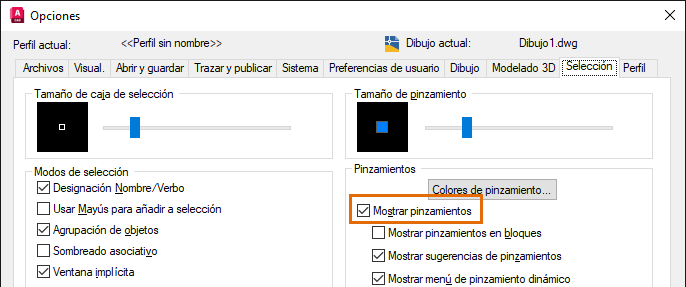 En la ficha Selección del cuadro de diálogo Opciones, asegúrese de que la opción Mostrar pinzamientos esté seleccionada.