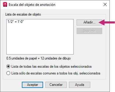 Una vez creado un objeto anotativo, puede añadir escalas de anotación adicionales al objeto o eliminar escalas que ya no sean necesarias. Las nuevas escalas de anotación afectan a la forma en que el objeto aparece en el espacio modelo y en las ventanas gráficas de una presentación.