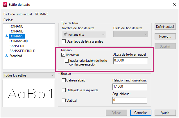 AutoCAD calcula y muestra automáticamente el texto a la altura necesaria en función de la altura de texto en papel y la escala de anotación asignadas.