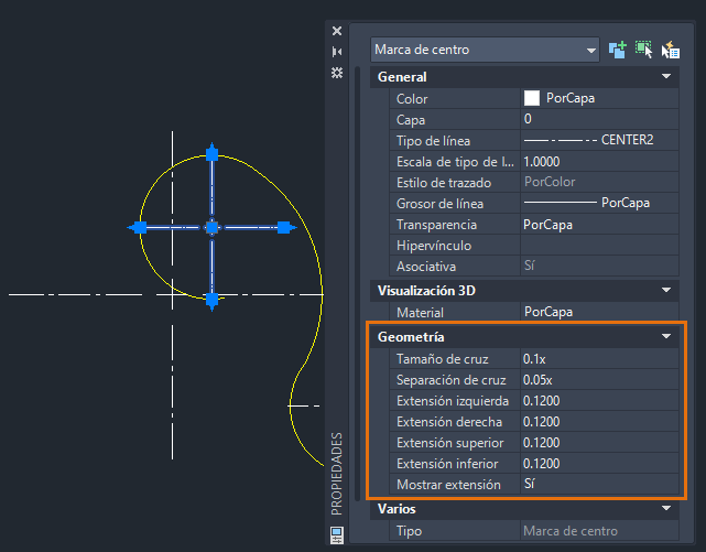Las propiedades también se pueden cambiar mediante la paleta Propiedades. Con la paleta Propiedades abierta, seleccione una marca o una línea de centro para verla y cambie propiedades como Color, Tamaño de cruz, Separación de cruz, Longitud de extensión, etc.