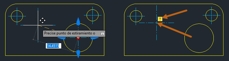Las marcas y las líneas de centro también se pueden editar mediante pinzamientos. Al colocar el cursor sobre un pinzamiento, se muestran las cotas dinámicas de la línea de referencia.