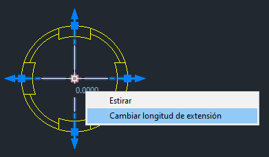 Al colocar el puntero sobre el pinzamiento central multifuncional de una marca de centro, se muestra un menú. Aquí puede estirar para mover la marca de centro y cambiar uniformemente la longitud de las cuatro extensiones de línea de centro.