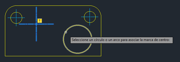 3. Cuando el monitor de anotación está activo, se muestra un distintivo amarillo que indica que la marca o la línea de centro se ha disociado de la geometría. En este ejemplo, la marca de centro se ha disociado sin mover la marca de centro ni suprimir la geometría.