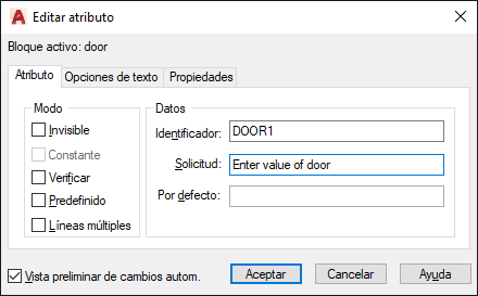 Activa y desactiva la asignación del valor por defecto. Si esta opción está seleccionada, se asignará al atributo su valor por defecto al insertar el bloque. Si se deja sin marcar, se ignora el valor por defecto del atributo y se solicita al usuario que escriba un valor al insertar el bloque.