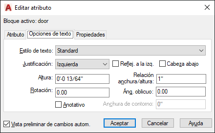 Controla si se debe actualizar el área de dibujo inmediatamente para que se muestren los cambios de atributo visibles que se hayan realizado. Si la casilla Vista preliminar de cambios autom. está marcada, los cambios se aplicarán acto seguido. En el caso contrario, éstos no podrán verse inmediatamente.