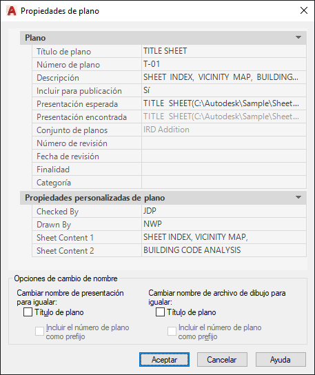 Muestra información específica del plano seleccionado, como el título, el número y si se incluirá en operaciones de publicación. También muestra las propiedades personalizadas, si las hay.