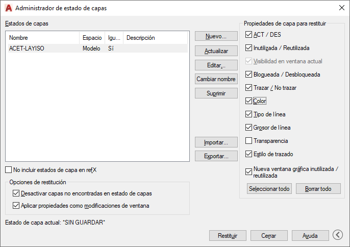 Restituye los parámetros de capa guardados en el estado de capa especificado en función de los parámetros que se encuentren activados en la columna Propiedades de capa para restituir.