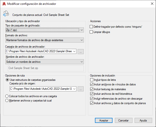 Cambia las rutas, formatos por defecto, organización y otros parámetros para un paquete de conjunto de planos archivado.