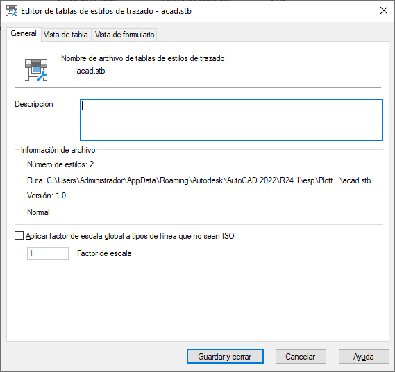 Muestra información acerca de la tabla de estilos de trazado que se está editando: número de estilos de trazado, ruta y versión del Editor de tablas de estilos de trazado.